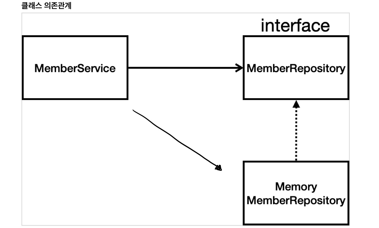 해당 MemberService는 사실 MemberRepository를 직접 선택하면서 인터페이스인 MemberRepository와 구현체인MemoryMemberRepository에 둘다 의존하고 있다. 즉, DIP에 위배된 것이다.