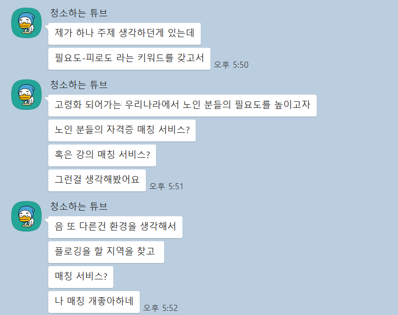 확실히 매칭쪽이 괜찮겠다고 생각하긴 했는데 노인의 사회적 필요도와 사회인들의 피로도를 연관짓는 아이디어를 먼저 제시해줬다.