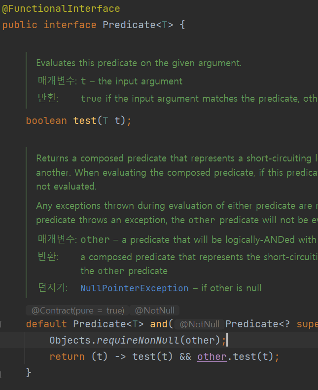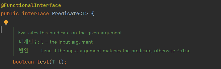 필터링을 위해 어떤 조건을 만족해야한다면 해당 조건을 정의하는 인터페이스를 만들고, 필터에서 그 조건을 만족하는 컬렉션 클래스의 값만 추가해주는 방식으로 코드를 구현할 수 있다. 해당 인터페이스를 아래와 같이 만들면 boolean을 반환하는 test를 만족하는 값들만 filter에서 추려서 정의할 수 있다. 이렇게 참, 거짓을 반환하는 함수를 프레디케이트(predicate)라고 한다.