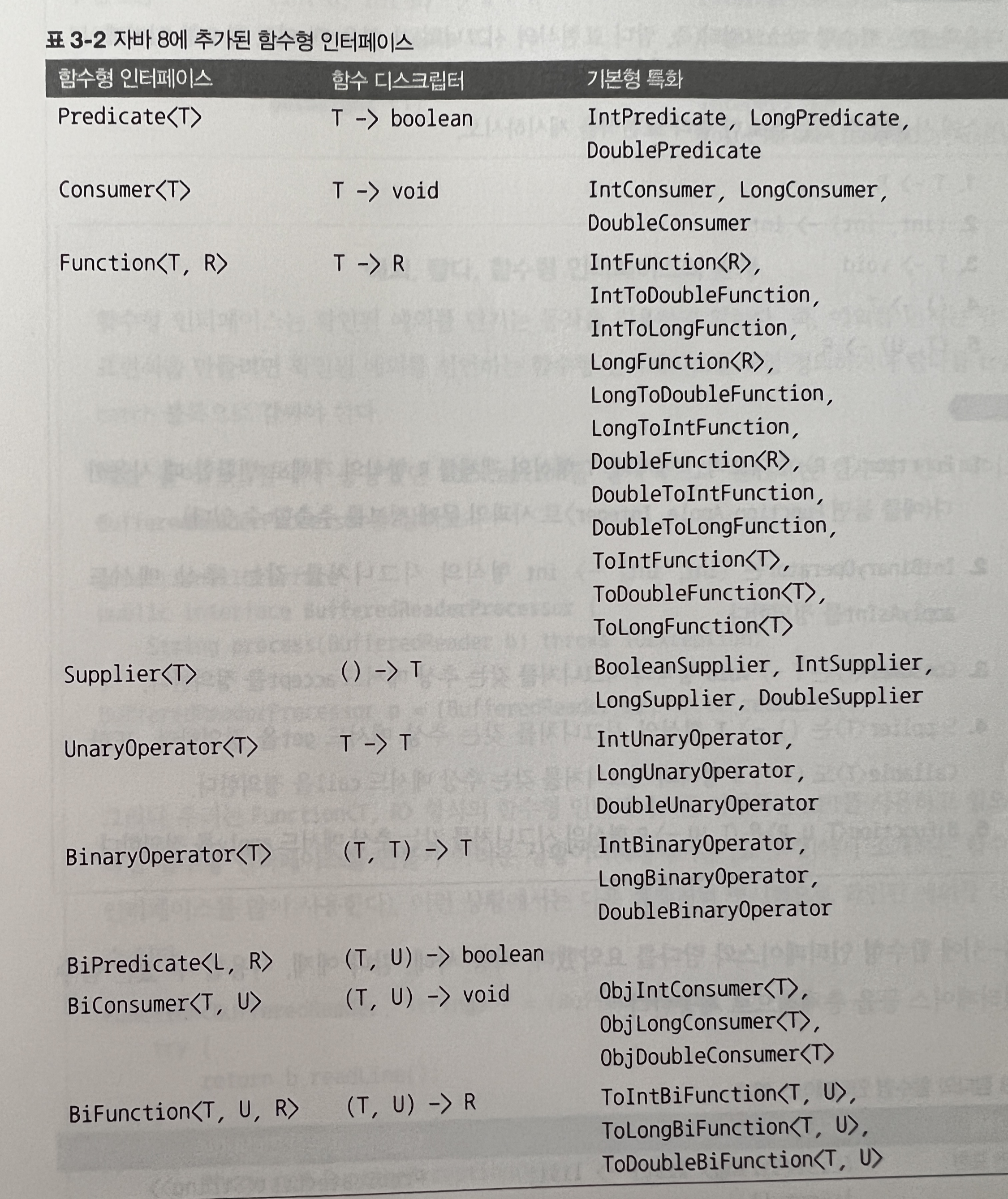 함수형 인터페이스의 추상 메서드 시그니처는 람다표현식의 시그니처를 가리킨다. 이때, 람다표현식의 시그니처를 서술하는 메서드를 함수 디스크립터라고 부른다. 람다 표현식에선 어떤 파라미터가 어떤 형식을 반환하는지가 중요한데 이를 설명한 것이 함수 디스크립터라는 것이다.