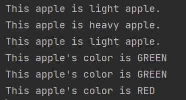 우선 ApplePredicate에 해당하는 인터페이스를 하나 만들고 무게에 따라, 색에 따라 다른 형식으로 출력하는 클래스를 구현했다.