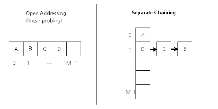 이를 위해선 해시값을 M개의 버킷으로 나누기 위한 다음 연산을 실행하는데 Open Addressing과 Seperate Chaining 두 가지 방법이 존재한다.