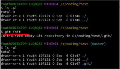 해당 디렉토리에 프로젝트 코드를 추가하고, 프로젝트 버전관리를 하고 싶은데 이를 git에게 맡기고 싶을때 사용하는 명령어가 `git init`이다. 아래와 같이 명령어를 실행하면 .git이라는 폴더가 생기는데 해당 디렉토리는 git에 의해 버전관리가 되는 디렉토리로 변하게 된것이다.