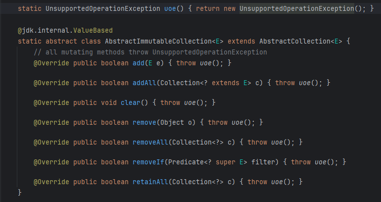 이는 가변 크기가 아닌, 고정된 크기의 팩토리메서드로, add, remove와 같은 크기를 변경하는 메서드가 실행될때 UnsupportedOperationException을 발생시킨다.