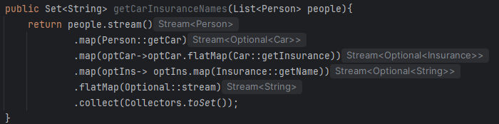 사람 목록을 이용해 가입한 보험사명의 Set을 구해보자. 이때 스트림을 사용하는데 반환하는 값이 Optional이므로 보다 세부적으로 구현을 해줄 필요가 있다.