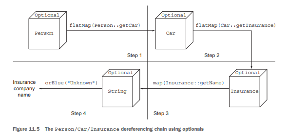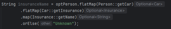 우선 `Person::getCar`의 반환형이 Optional<Car>이므로, 여기서 Optional<Insurance>를 얻기 위해선, flatMap을 사용해야한다.