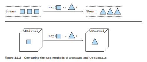 map은 스트림의 map과 유사한다. Optional객체를 값이 최대 1개 이하인 데이터 컬렉션으로 생각하면 map에 대한 이해가 도움이 된다.
