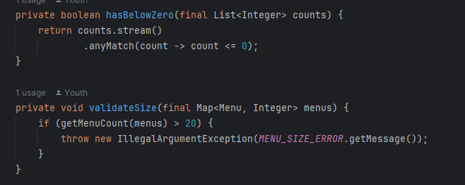 경우에 따라 반환할 0, 주문 메뉴 제한 개수 등 아래와 같은 부분도 빼야할까 싶었다.