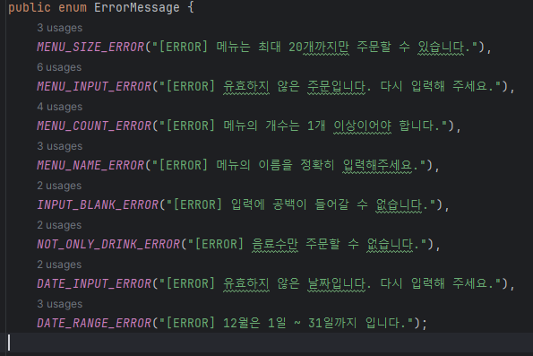 에러메시지는 연관된 로직이 없으니 상수 클래스를 활용하는 것이 더 좋았을 것 같다.