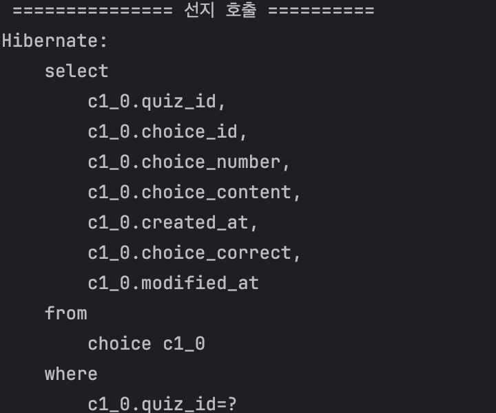 문제를 조회할 때 양방향 매핑을 쓴다고 쿼리가 줄어들까? 객관식 문제에 양방향 매핑된 Choice(선지)를 조회하는 쿼리를 비교해보자.