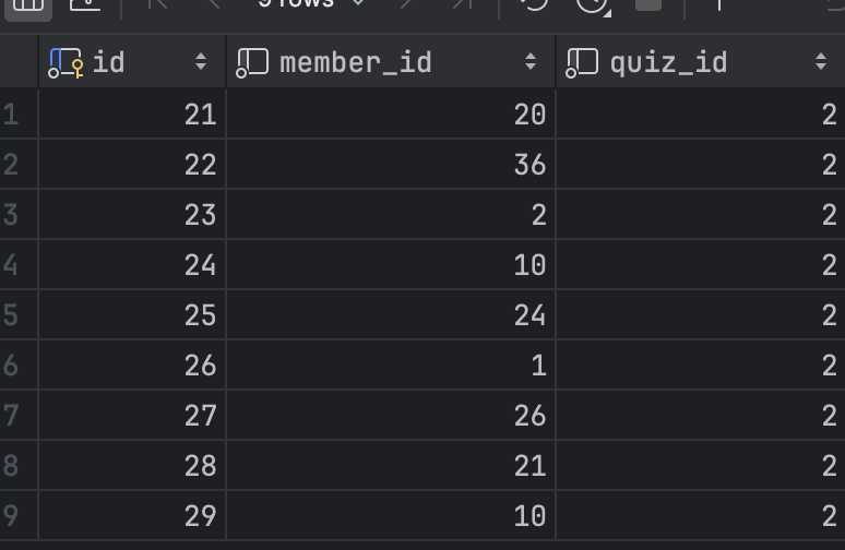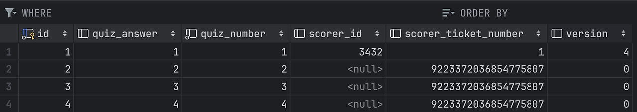 이렇게 DB설계를 바꾸면, 퀴즈가 이미 생성되어있기에 테이블 단위로 락을 걸지 않고 득점자 존재를 확인하고 쓰는 작업에 테이블 단위의 락을 거는게 아닌 quiz_id 에 해당하는 row에만 락을 걸 수 있다.