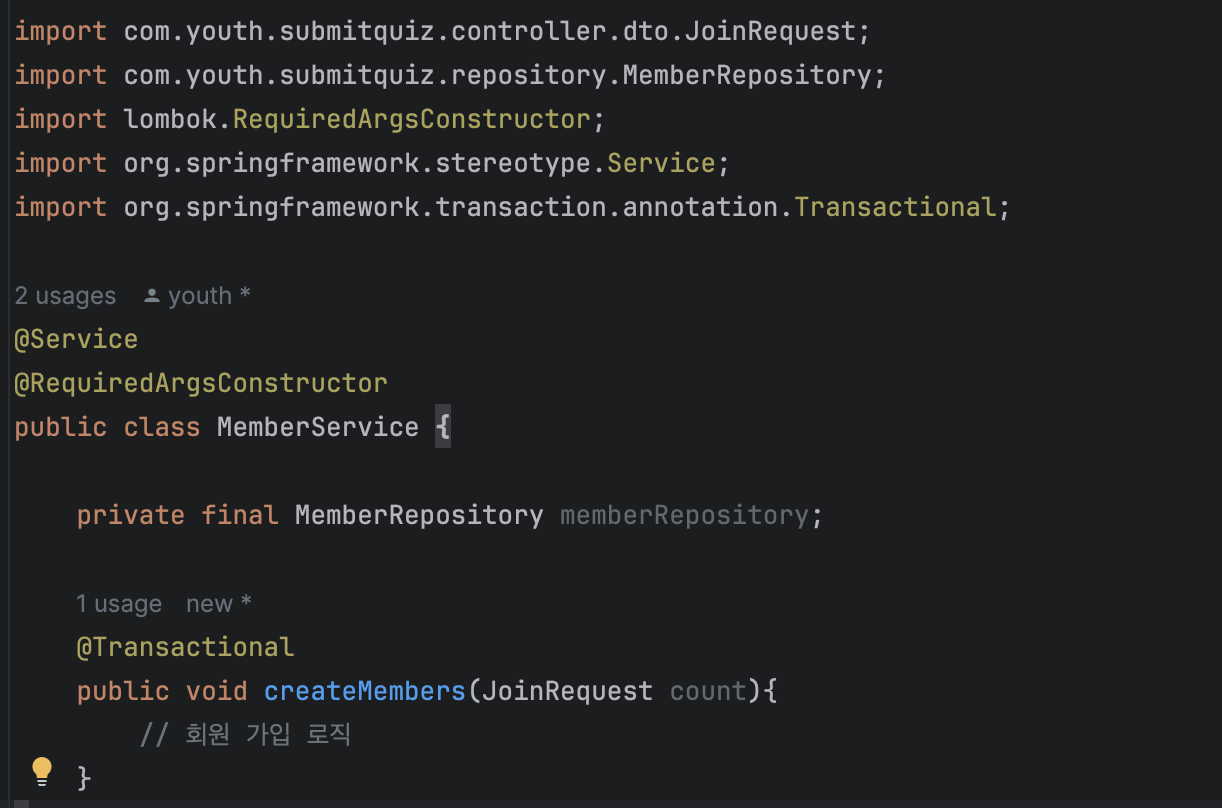 public JoinServiceDto createMembers(String memberName, String memberPhone){