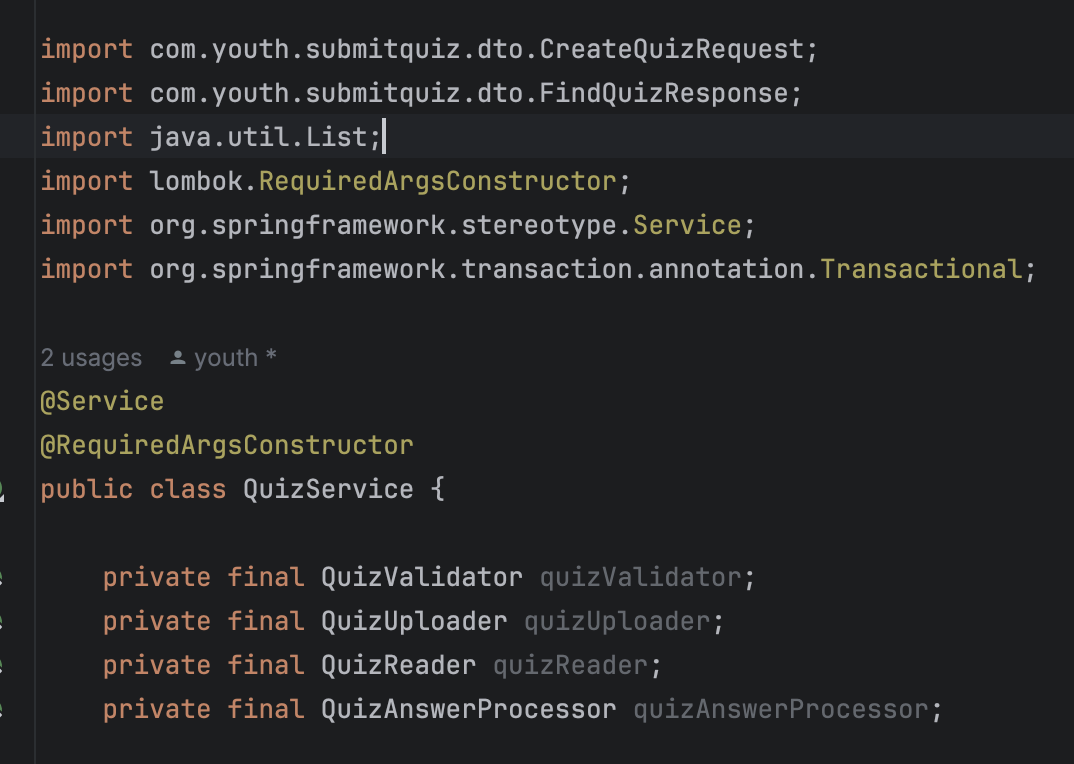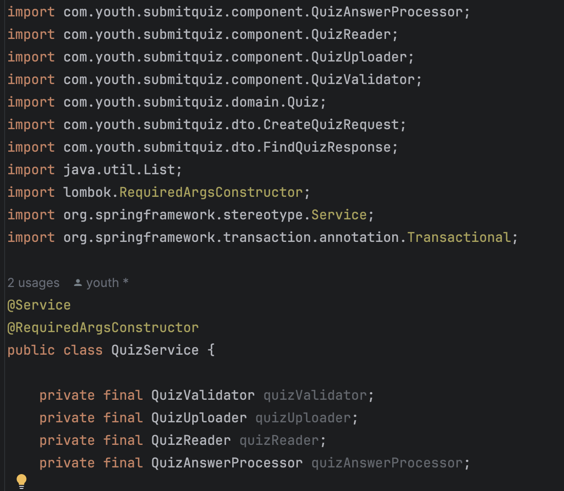 같은 도메인(Quiz)의 다른 서비스나 컴포넌트들을 많이 import한다.
