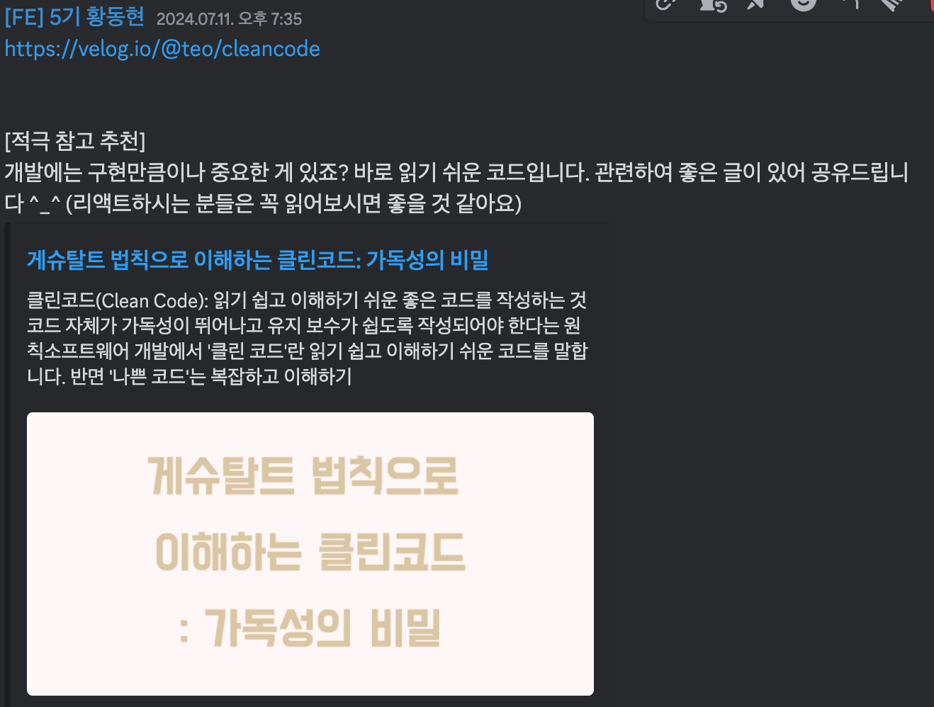 나름 팀장으로 글의 흐름을 잡는 방법에서 느끼는 점들을 공유하고, 이와 관련된 리뷰를 해보라고 방향 제시를 했는데 부원들이 이를 잘 따라줘서 유익하고 만족스러운 스터디가 되어 가고 있다.