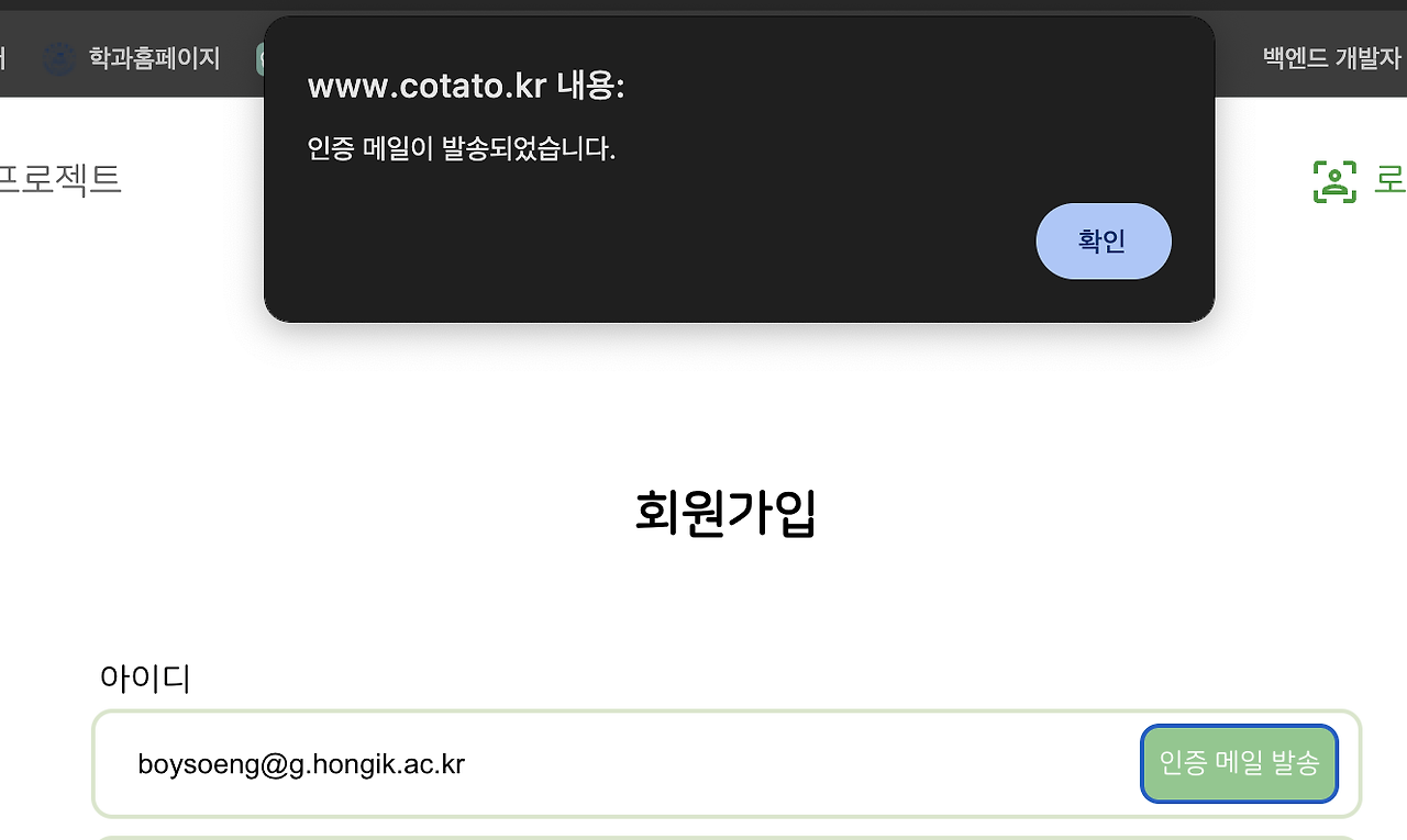 현재 이메일 인증 랜덤 코드를 발생할때 요청 이후 인증코드 발송까지 꽤 오랜시간이 걸리는데, 클라이언트에서 인증코드 발송 요청을 보낸 후 요청이 성공했다는 서버의 응답이 오면 아래와 같은 팝업을 띄운다.