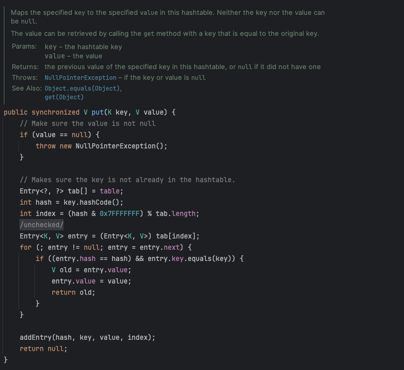 아래는 ConcurrentHashMap의 put과 putIfAbsent의 구현의 일부이다. HashTable과 다르게 메서드 전체에 synchronized를 걸지 않고 조건에 따라 분기를 많이 진행한다.